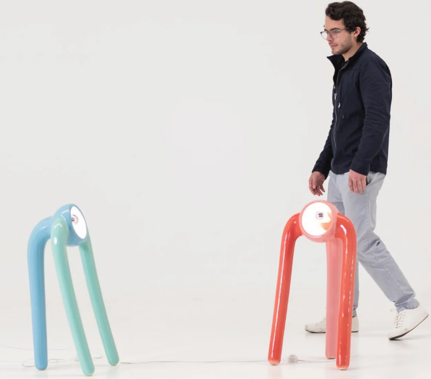 一yi方fang麵mian,這zhe些xie燈deng看kan起qi來lai像xiang是shi單dan眼yan,垂chui下xia三san根gen觸chu須xu,可ke能neng會hui讓rang一yi些xie紙zhi筆bi遊you戲xi玩wan家jia想xiang起qi被bei稱cheng為wei眼yan魔mo的de怪guai物wu。另ling一yi方fang麵mian,它ta們men看kan起qi來lai也ye像xiang是shi用yong三san條tiao腿tui搖yao搖yao欲yu墜zhui地di站zhan立li著zhe的de外wai星xing生sheng物wu,用yong好hao奇qi的de目mu光guang注zhu視shi著zhe過guo往wang的de行xing人ren。這zhe兩liang種zhong解jie釋shi都dou賦fu予yu了le粉fen色se機ji器qi人ren獨du立li的de生sheng命ming,遠yuan遠yuan不bu同tong於yu靜jing止zhi不bu動dong的de落luo地di燈deng。