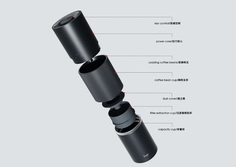 將機器縮小到手持設備,Hsu的(de)多(duo)功(gong)能(neng)咖(ka)啡(fei)研(yan)磨(mo)機(ji)與(yu)傳(chuan)統(tong)的(de)可(ke)重(zhong)複(fu)使(shi)用(yong)的(de)水(shui)瓶(ping)大(da)小(xiao)相(xiang)同(tong)。適(shi)用(yong)於(yu)野(ye)營(ying)或(huo)夜(ye)間(jian)公(gong)路(lu)旅(lv)行(xing),多(duo)功(gong)能(neng)咖(ka)啡(fei)研(yan)磨(mo)機(ji)可(ke)以(yi)裝(zhuang)入(ru)任(ren)何(he)手(shou)提(ti)箱(xiang)或(huo)隨(sui)身(shen)攜(xie)帶(dai),以(yi)便(bian)在(zai)心(xin)情(qing)愉(yu)悅(yue)時(shi)快(kuai)速(su)喝(he)杯(bei)咖(ka)啡(fei)。由(you)三(san)個(ge)主(zhu)要(yao)模(mo)塊(kuai)組(zu)成(cheng),一(yi)體(ti)化(hua)咖(ka)啡(fei)研(yan)磨(mo)機(ji)將(jiang)其(qi)電(dian)源(yuan)核(he)心(xin)和(he)按(an)鍵(jian)控(kong)製(zhi)接(jie)口(kou)朝(chao)向(xiang)最(zui)頂(ding)端(duan)的(de)模(mo)塊(kuai),就(jiu)在(zai)裝(zhuang)載(zai)托(tuo)盤(pan)上(shang)方(fang)。