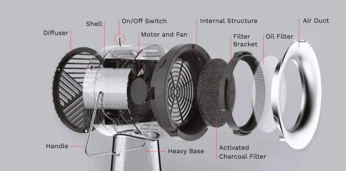 AirHood的產品設計jihukanqilaixiangyitaidianfengshan,danshijishangtadegongzuofangxiangxiangfan,taqiangdadefengshanhuixizoupengrenchanshengdeyanwu。dangran,jinjinquchuyanwushibugoude,kongqizhaodetongfengqirangkongqitongguomutanguolvqi,yifangzhiqiweichongmannidechufanghefangzi。zhexiekeyihenrongyidigenghuan,dantamenhuichixujigeyue,ranhounijiuxuyaozheyangzuole。