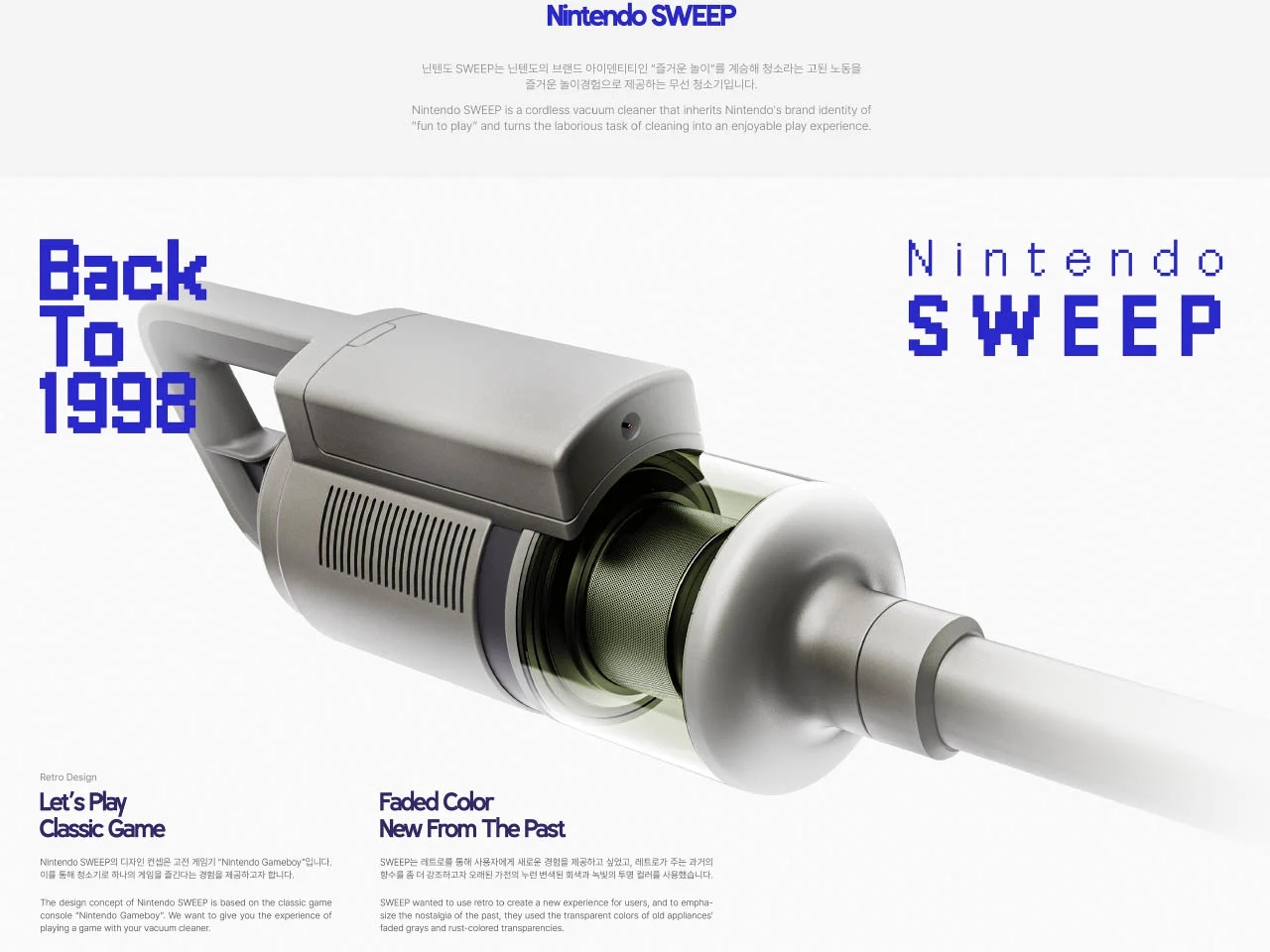 在核心,任天堂是關於遊戲和冒險-任天堂掃描保留了這一元素的設計是現代的。它有舊電器魅力的回憶,在褪色的灰色和生鏽的透明度。該設備將任何清理任務轉化為一個有趣的遊戲界麵,在伴隨任天堂遊戲機觸摸屏。你可以用一個操縱杆控製真空吸塵器,以調整功能元件,包括吸力調整,以及通過拉和推操作的功率輸送量。在虛擬世界裏,它控製著遊戲內容,它可以是從無止境的跑步冒險或賽車車在跑道上為領先而鬥爭的任何東西。